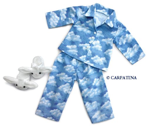 Cloud Nine pajamas set includes the coziest pajamas a dreamy cloud print cotton And for extra warmth slip on her snuggly bunny slippers Pajamas made in a dreamy cloud print cotton Snuggly white bunny slippers Made by Carpatina for 18 American Girl Dolls and similar size dolls New factory seale Read More..