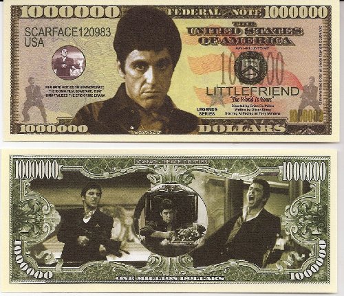Al Pacino Scarface Million Dollar Novelty Bill Collectible These bills are the same size and feel of real money They are finely detaileds and colorful on both front and back with high quality printing Makes a great gift collectible or frame and display Price listed is for 1 bill Buy as many Read More..
